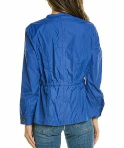 - Vista Linen Jacket in classic blue with dual chest pockets, inner drawstring waistband, mock neck, dual side on-seam pockets, and button cuffs