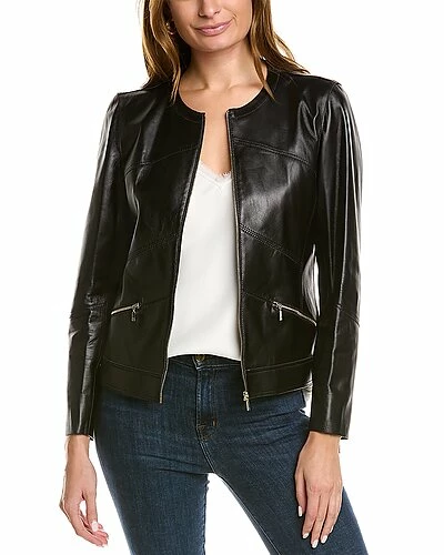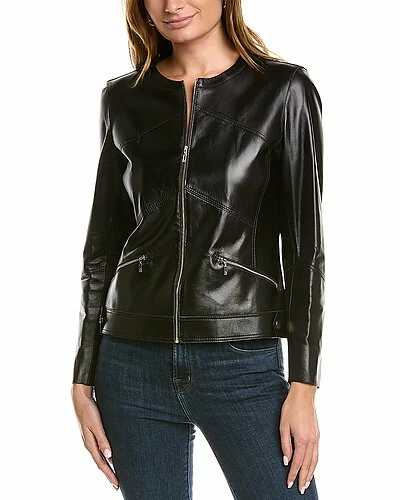- Adeline Leather Jacket in black with dual front zip pockets and zippered cuffs