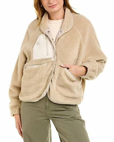 - Teddy Bomber Jacket in beige with spread collar, three front zip pockets, and elasticized cuffs