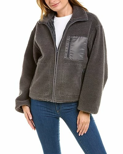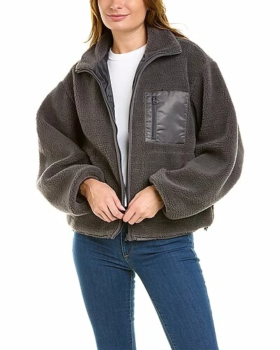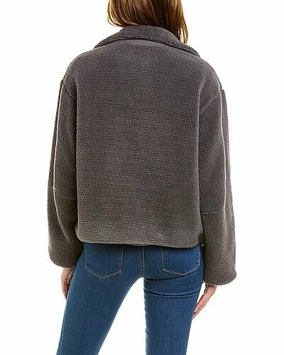 - Teddy Jacket in grey with spread collar, left zip chest pocket, dual front zip pockets, elasticized cuffs, and drawcord hem