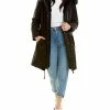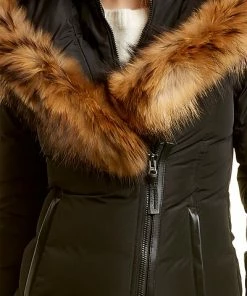 - Design details: shawl hood back with fur trim, inner bib with rib-knit stand-up collar, rib-knit cuffs, two zippered front pockets, leather trim