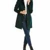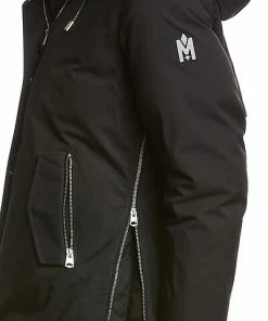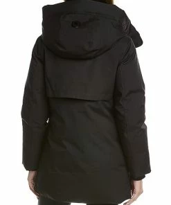 - Kinslee 2-In-1 Oversized Leather-Trim Down Parka in black with hooded funnel neck, removable inner bib with stand-up collar, four front pockets, inner rib cuffs, storm panel at back yoke, and zippered side slits at hem