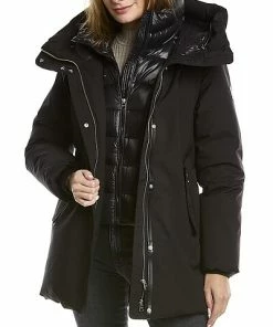 - Kinslee 2-In-1 Oversized Leather-Trim Down Parka in black with hooded funnel neck, removable inner bib with stand-up collar, four front pockets, inner rib cuffs, storm panel at back yoke, and zippered side slits at hem