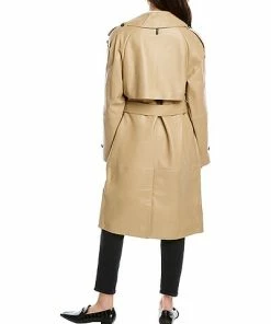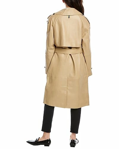 - Trisha Leather Trench Coat in beige with notched lapel, storm flap accents, strap detail at shoulders and cuffs, two front pockets, belted waist and center vent at back hem