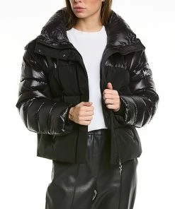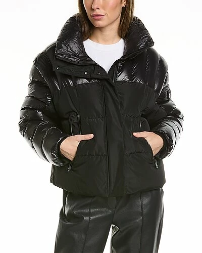 - Vesna Down Jacket in black with funnel neck, zip-off sleeves, two zippered front pockets, inner cuffs, and drawcord at hem