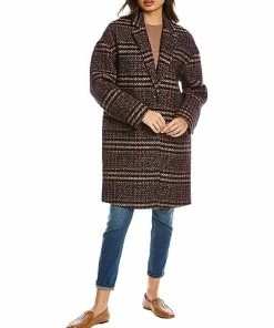 - Estelle Cocoon Plaid Wool-Blend Coat in purple plaid with notched lapel, two front flap pockets and quilted lining