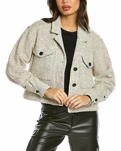 - Jessie Shirt Jacket in black/white with notched lapel, dual chest pockets, button cuffs and cropped hem