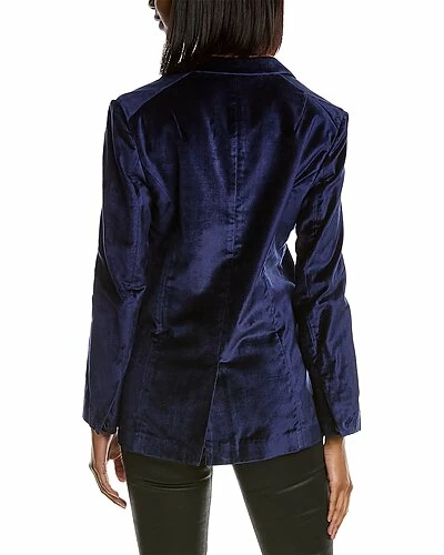 - Margot Velvet Blazer in blue with notch lapel, left chest pocket, two front pockets, button cuffs, and center vent at back hem