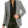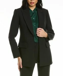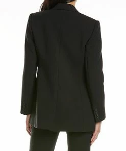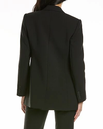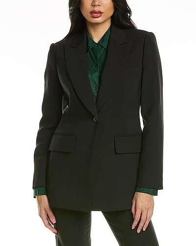 - Refined Suiting Wool-Blend Blazer in black with peak lapel, left chest pocket, dual front flap pockets, button accents at cuffs and center vent at back hem