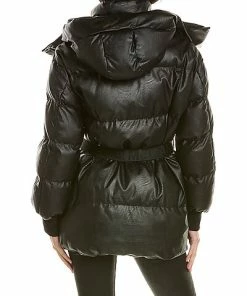 - Kayla Coat in black with quilted faux leather construction, stand collar, hooded back, logo taping belt at waist, dual side seam pockets and ribbed cuffs