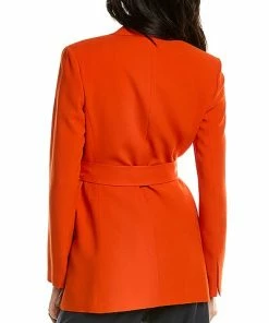- Belted Blazer in fire opal with notch lapel, dual front pockets, and self-tie sash at waist