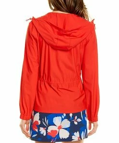 - Eliza Islandzone Zip Jacket in Zanzibar red with hooded back, cinched back, side slip front pockets, and elasticized cuffs