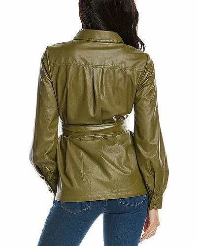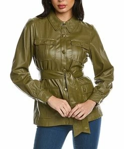 - Aviation Jacket in saguaro with faux leather design, dual chest pockets, two front pockets, and tie sash at waist