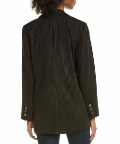 - Jacquard Blazer in rich black with peak lapel, dual front pockets, left chest pocket, button cuffs, and vented back hem