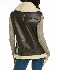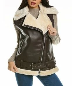 - Donna Leather Vest in mocha with faux fur trim and lining, two zippered front pockets, and belted hem