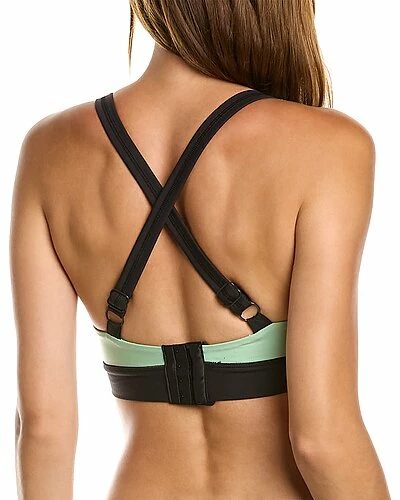 - Solid Scoop Bra Top in fair green/black with colorblocked design, adjustable back straps and removable soft cups