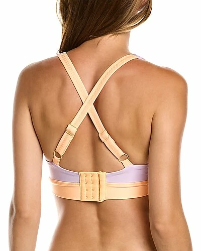 - Solid Scoop Bra Top in orchid/orange with colorblocked design, adjustable back straps and removable soft cups