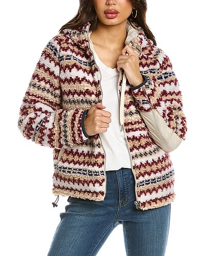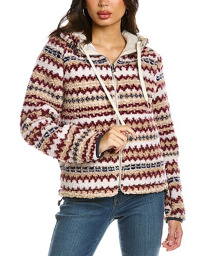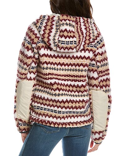 - Fair Isle Sherpa Hoodie in ivory multicolor with printed sherpa fabric, contrast sleeve panels, drawstring hood and dual front pockets
