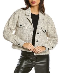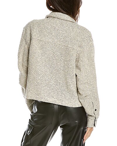 - Jessie Shirt Jacket in black/white with notched lapel, dual chest pockets, button cuffs and cropped hem