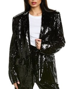 - Chessy Blazer in black with sequined design, notch lapel, faux front pockets, and faux button cuffs