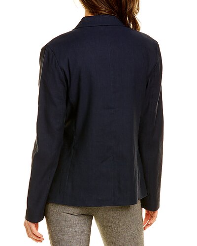 - Linen-Blend Jacket in navy with notch lapel, left chest pocket, two front pockets, and center vent at back hem