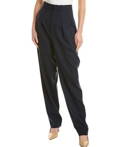 - Suiting Wool-Blend Pant in navy with seamed leg, dual front angled pockets, dual back welt pockets, and belt loops