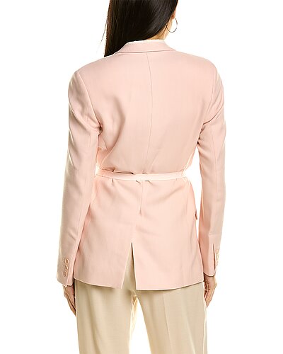 - Bella Wool-Blend Jacket in pink with peak lapel, left chest pocket, dual front pockets, button cuffs, belted waist, and vented back hem