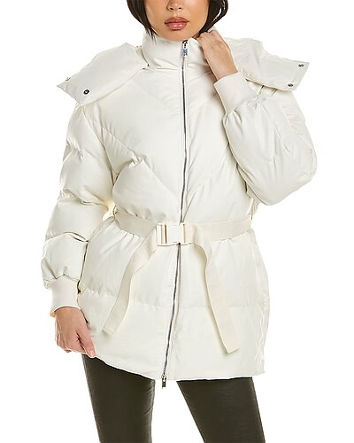 - Kayla Coat in white with quilted faux leather construction, stand collar, hooded back, logo taping belt at waist, dual side seam pockets and ribbed cuffs