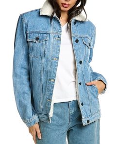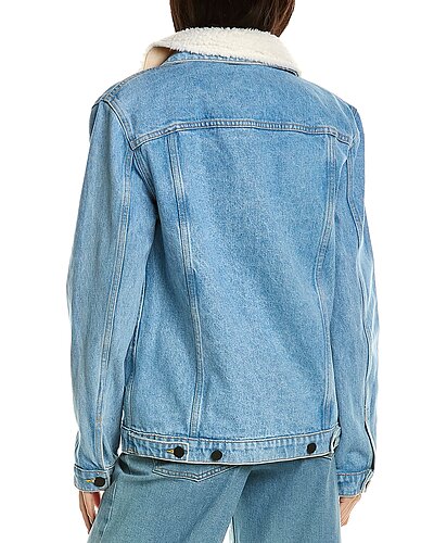 - Denim Jacket in light indigo with fuzzy spread collar, dual chest pockets, dual front pockets, and button cuffs
