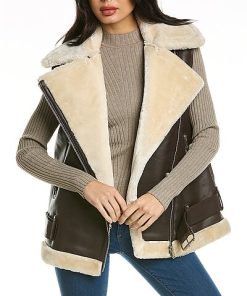 - Donna Leather Vest in mocha with faux fur trim and lining, two zippered front pockets, and belted hem