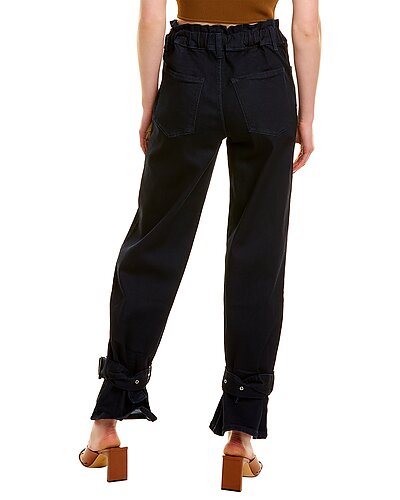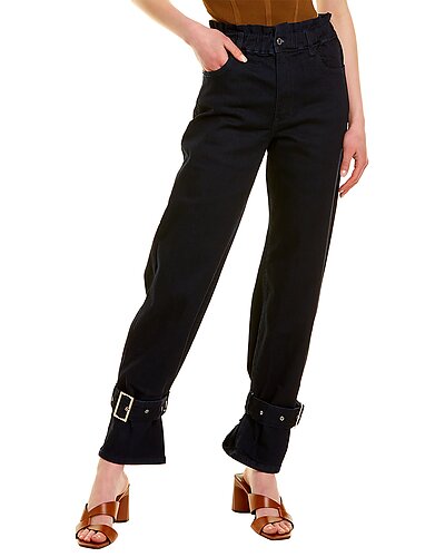 - Paperbag Straight Ankle Pant in rinse with elasticized paperbag waist, belt loops, four-pocket styling and flared cuffs with belt detail