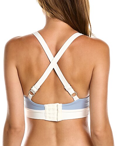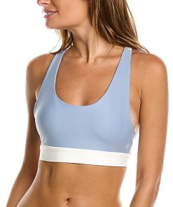 - Solid Scoop Bra Top in dusty blue/off white with colorblocked design, adjustable back straps and removable soft cups